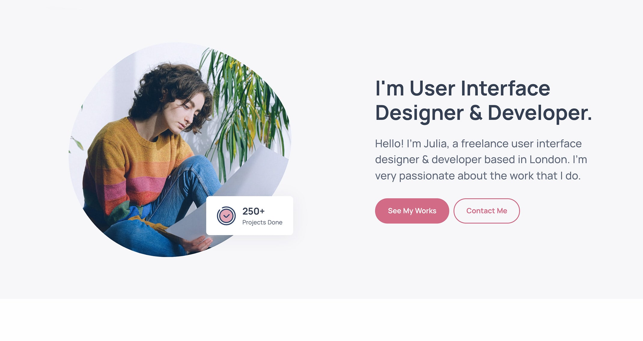 <p class="lead fs-24 px-md-10 px-lg-0 mx-lg-n10 mx-xl-0 mb-8">I’m very passionate about the work that I do, and if you are curious you can find my works on <a href="#" class="hover" style="color: var(--bs-dribbble);">Dribbble</a>, my portfolio on <a href="#" class="hover" style="color: var(--bs-behance);">Behance</a>.</p>